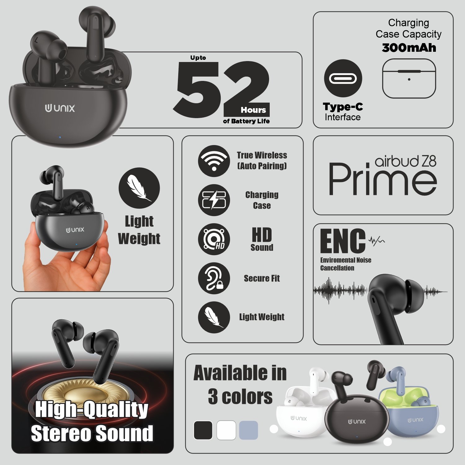 Experience true wireless freedom with the UNIX Z8 Prime Airbuds — engineered for comfort, clarity, and long-lasting performance. The 10mm copper speakers deliver deep bass and crisp treble for a powerful stereo experience.