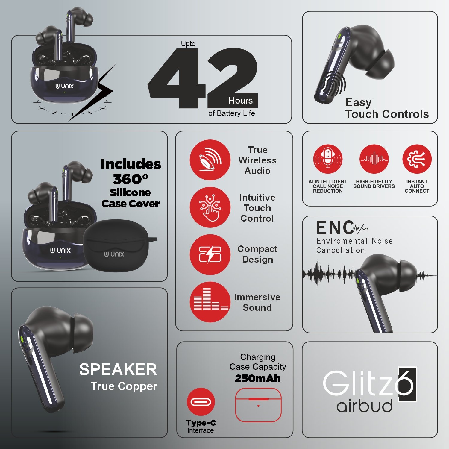 The UNIX Glitz6 (Z6) earbuds combine style and performance in one sleek design. With true wireless stereo sound, you can enjoy immersive audio with each earbud delivering powerful, crystal-clear tones.
