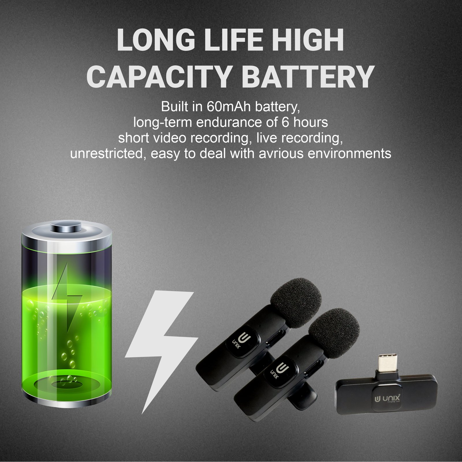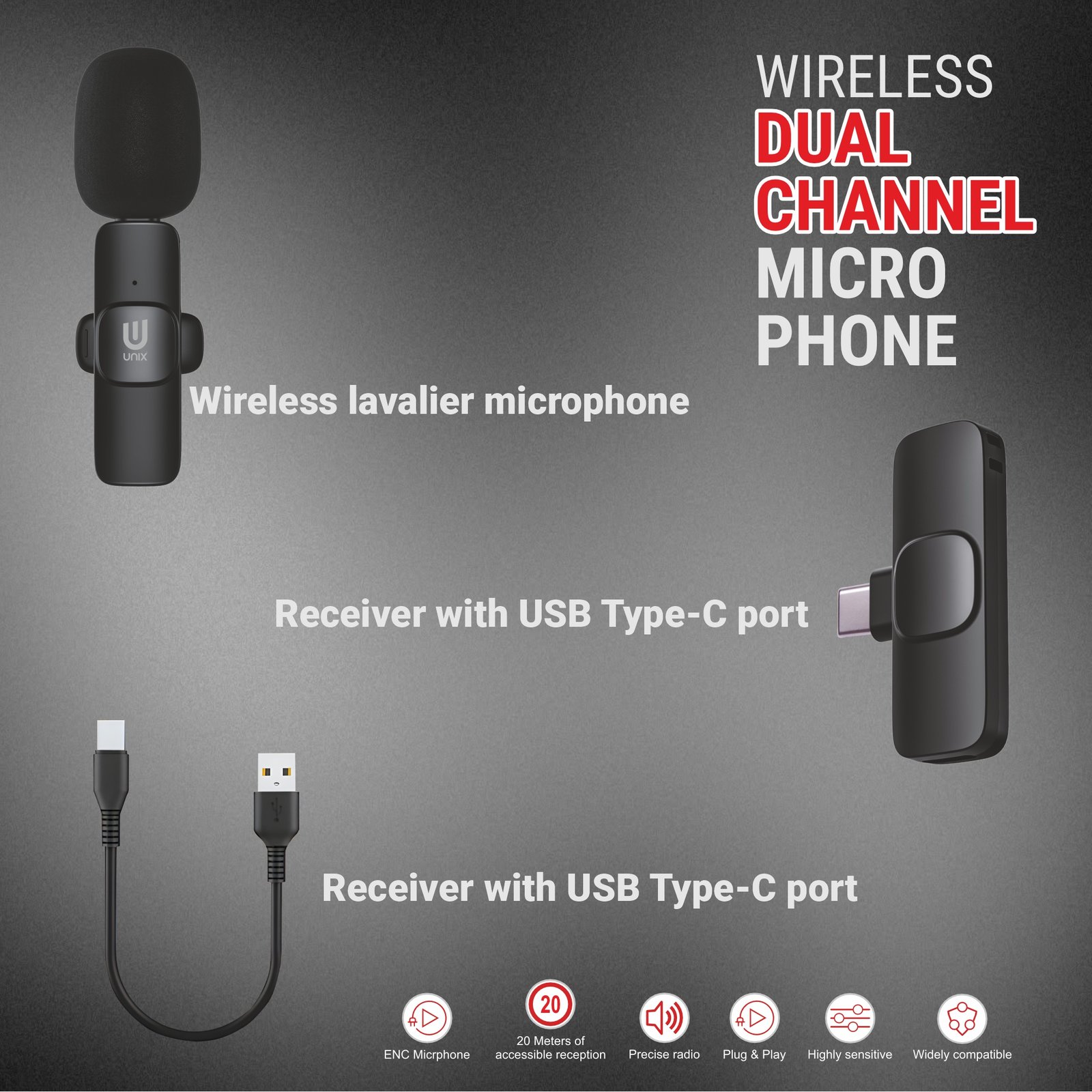 Elevate your audio recording experience with the UNIX MC2 Wireless Dual Microphone. Designed for interviews, vlogs, live shows, and short videos, this high-sensitivity microphone ensures crisp and clear sound with ENC noise cancellation and real-time auto-sync. Offering a 20m stable wireless reception, 2.4GHz adaptive frequency hopping for interference-free audio, and a low 30ms transmission delay, it delivers seamless recording anywhere. With a Type-C to Lightning connector, it’s widely compatible with multiple devices. Enjoy up to 6 hours of battery life on a single charge, and get back to recording quickly with fast 2-hour charging. Just plug and play for effortless pro-level audio!