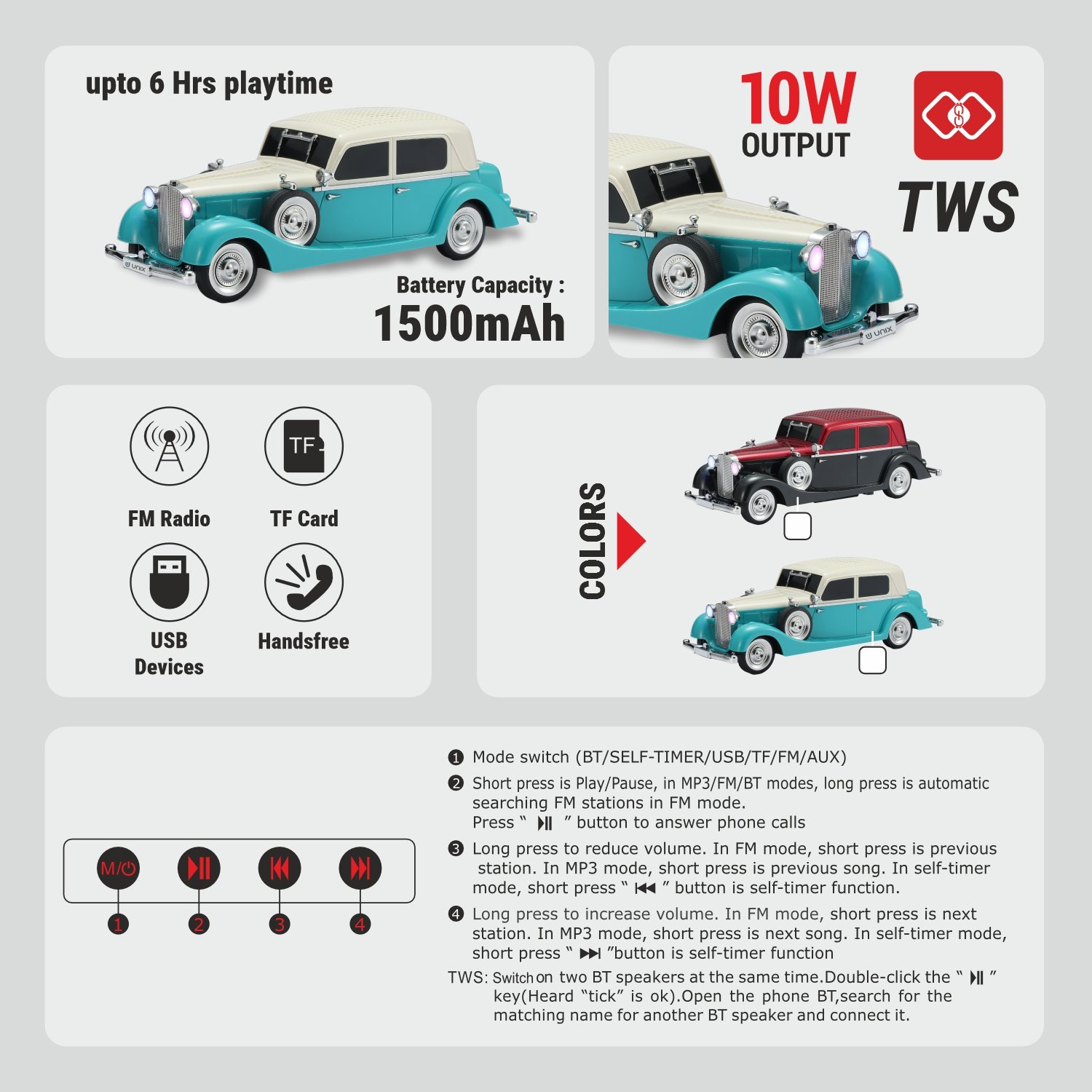 Bring retro charm and modern technology together with the UNIX Pontiac 34 Vintage Classic Music Car Speaker. Inspired by the timeless 1934 Pontiac design, this unique 10W wireless speaker combines elegant craftsmanship with powerful, high-fidelity audio.