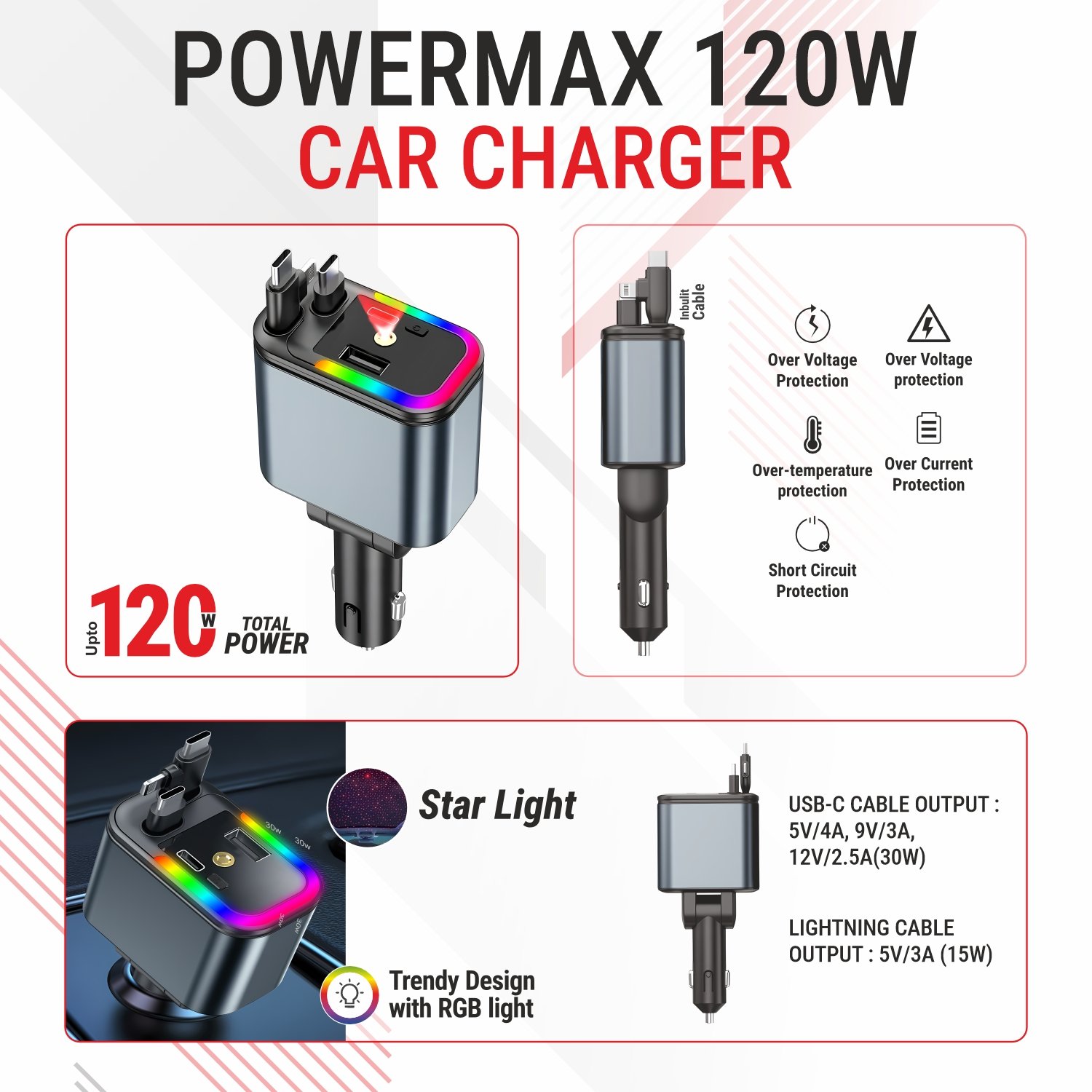 Power up your journey with the Unix UX-C99 120W Car Charger, engineered for speed, safety, and smart performance. Featuring dual USB ports and inbuilt Type-C + Lightning cables, this all-in-one powerhouse lets you charge multiple devices simultaneously at blazing-fast speeds. With PD 30W + QC 30W technology, it delivers stable and efficient charging for smartphones, tablets, and even power-hungry gadgets. The RGB “Star Light” design adds a modern touch to your car’s interior, while the multi-layer safety protection safeguards against overheating, overvoltage, and short circuits. Built with premium-grade materials and a compact body, the Unix UX-C99 is your perfect travel companion for on-the-go charging convenience.