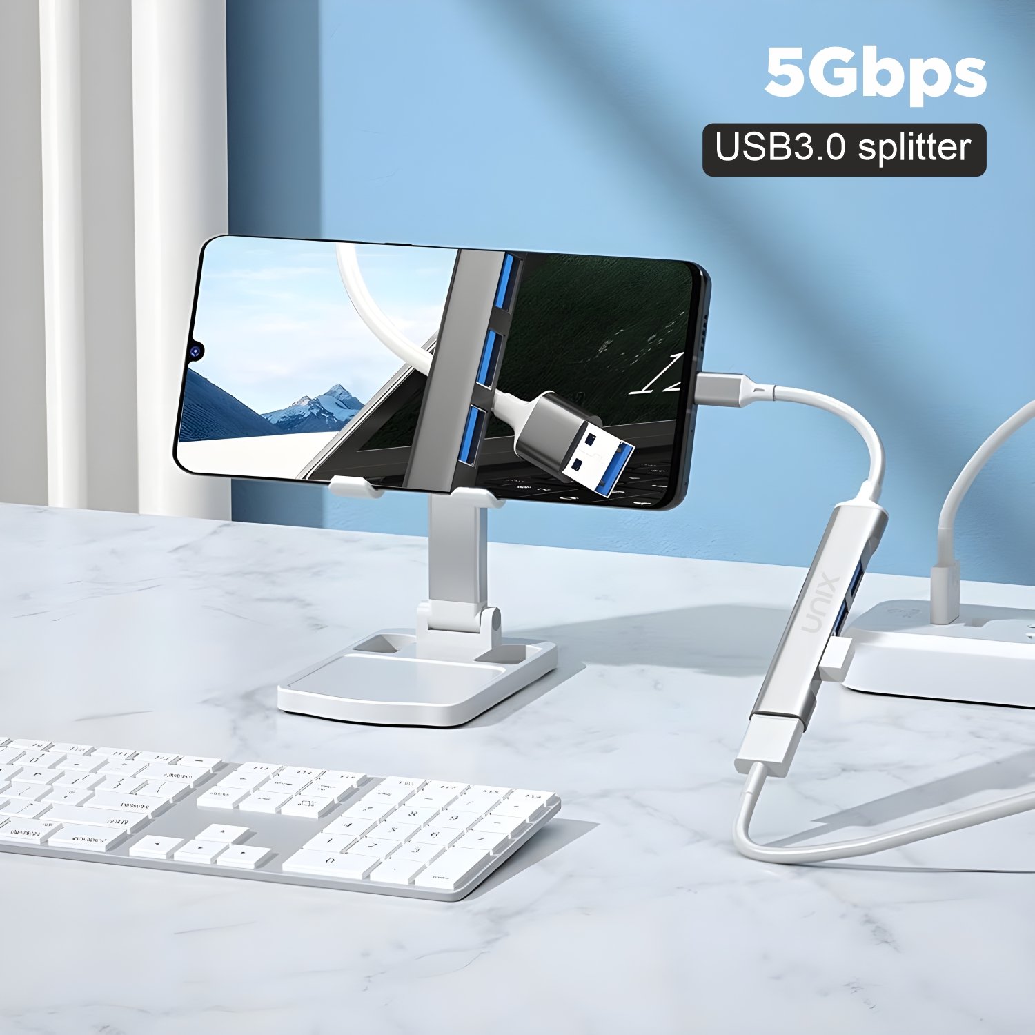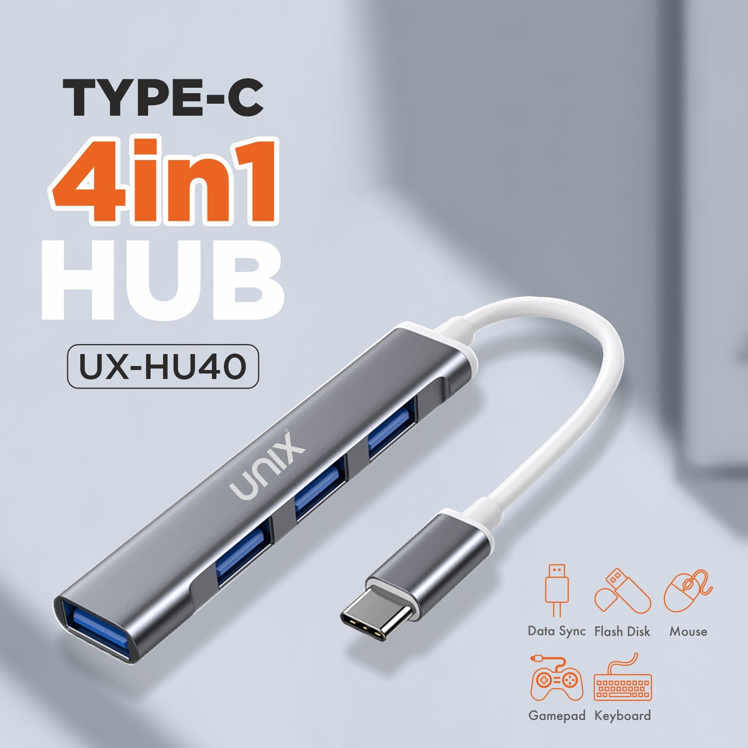 The UNIX UX-HU40 Type-C Hub is a 4-in-1 USB expansion solution designed for productivity and convenience. It allows simultaneous connection of multiple devices through four high-speed USB 3.0 ports, supporting data transfer speeds up to 5 Gbps for efficient performance.